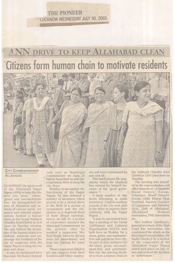 Even when Shri Chatterjee was the Municipal Commissioner of Allahabad he had to face the onslaughts of some selfish rowdy elements because of his “Operation Clean Programme” who attacked his office but the enlightened citizens of Allahabad formed a human chain as a protest against the vandalism in favour of Shri Chatterjee. This was a unique support and the only of its kind in India when people thronged the road of Civil Lines and formed a Human Chain from the Coffee House to the Subhash crossing in support of Shri Chatterjee in **** 2012. Again when the various negative elements of society and especially the politicians for their own selfish interest were successful in getting him transferred from the post of Municipal Commissioner, the intellectuals of Allahabad assembled in the Bishop Johnson Inter College, Allahabad to condemn his transfer. The citizens included Judge of the High Court. Vice Chancellor, Professors and other intellectuals besides octogenarian Ex Minister Late P.D. Tandon who came in a wheelchair to voice the protest
