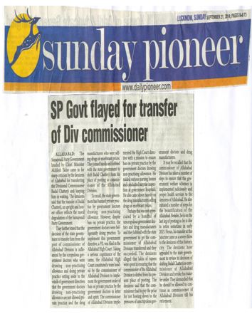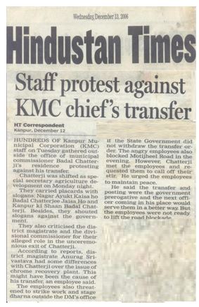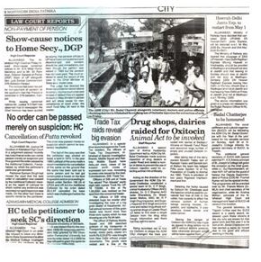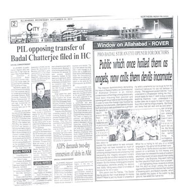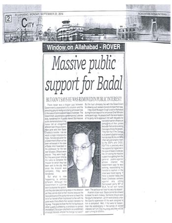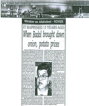 When Shri Badal Chatterjee was transferred from the post of Additional District Magistrate City Allahabad to Mirzapur as Chief Development Officer in July 2000 as he was implementing rules and regulation in the city, and making an attempt to establish the rule of law started. It was at Allahabad which was the only city in India where the prices of onion and potato was controlled by him in the year 1999 (because of the price hike the Bhartiya Janta Party government lost in the Assembly Elections in Delhi ).*******. Their was a panic that there is a scarcity of salt the entire State and the people went berserk in purchasing it but from prompt action taken by him brought the matter under control in Allahabad whereas in other Districts of Uttar Pradesh it prevailed for 3-4 Days. He controlled the sound pollution banned the sale of illegal crackers****** and because of his compassion for animals he tired to stop the injecting of Oxytocin on the innocent milching cattles.***9 The good citizens of Allahabad protested in his favour and the Teachers’ Association of the University of Allahabad (known as the Oxford of the east) filed a Public Interest Litigation (PIL) at the High Court of Allahabad. For the then Judges of Allahabad the good work of Shri Badal Chatterjee did not go unnoticed and they gave a stay order in his favour. The next day the Northern India Patrika in its front page carried out the news “Judicial Stamp on People’s wishes''.