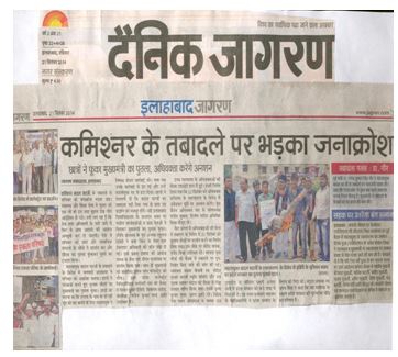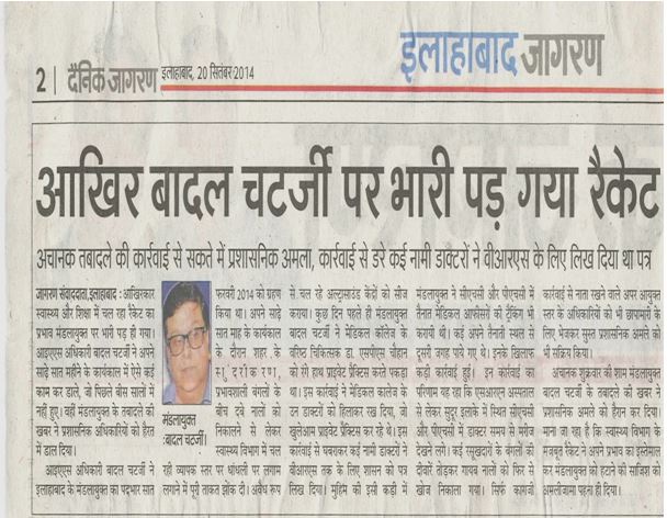 People of Allahabad were very happy when he became the Commissioner of Allahabad Division Allahabad in February 2014. During his short tenure of seven months he made the people of his division realize the immense power and authority of the institution of Divisional Commissioner. He made medical facilities available free of cost to the needy and poor people of the Allahabad Division. He freed the masses from the exploitation of some of the greedy and selfish Medical practioners who inspite of receiving non-practising allowance were neither teaching the medical students nor attending them in the government medical college and were out to disgrace the noble profession and without adhering to the oath of Hippocrates they were siphoning the patients to the private hospitals so that they could flourish on their illegal private practice at the cost of the poor patients. He was successful in freeing the Swarup Rani Medical College from the tentacles of touts and middle men. He provided them medicines free of cost from the government hospitals. He also revealed the illegal practice of selling the medicines at a high rate by the drug owners with the connivance of the doctors, Several surgeons were damaging the surgical instruments in the medical college so that the patients are forced to go to the nursing homes illegally running by them. They were putting pressure on the Senior Residents not to treat the serious patients and divert them to their respective private nursing homes other wise they will fail in their MS Examination. During the drive about 17 private ambulances of the touts who use to coax and carry the patients from medical college premises to the nursing homes were seized. Due to Mr Chatterjee’s untiring efforts the bed occupancy of the medical college which was limited between 25-30% was increased to almost 100%. He floated the idea of purchasing generic cheaper and effective medicines from the market in case of emergency, and eventually was successful in creating a dent in the impregnable fortress of the Drug Racketeers. He ensured the presence of the doctors and teachers in the rural areas by mobile tracking system, which none had ever thought of. He made it compulsory for the doctors of Primary Heath Centres to attend and provide free medicines to the rural folk who earlier were left with no option but to go to the nursing homes of the cities were they were badly exploited. The availability of the teachers increased the attendance of the rural children which resulted in the increase of Mid Day Meal. The government however yielded before the negative stake holders of the society and he was transferred to Lucknow as Commissioner Food Safety and Drug administration UP, but the people of Allahabad and other districts of Allahabad Division did not take the decision of the government as a lying down fact. His transfer sent shock waves throughout the division.. There was a tremendous uproar and public outcry and all sections of people started protesting in the form of dharna, candle march, road blockade, even the members of the ruling party came out on the streets. The Lawyers of Allahabad High Court staged a demonstration at Subhash Crossing in Civil Lines. Banners were set up in various parts of the city as a mark of protest. The natural upsurge continued for five days unabated, the press and the electronic media also decried the action of the government. People have heard about protests to transfer an official on grounds of corruption and non performance but never in the annals of history in India it has ever been heard that masses were raising their voice to stall the transfer of an upright official. The Google has termed his extraordinary work as’ Badal Chatterjee Singham ’( Singham is a hindi film where the officer was upright and was able to bring ‘Good Governance’ despite of many hurdles ) which can be viewed on the Google